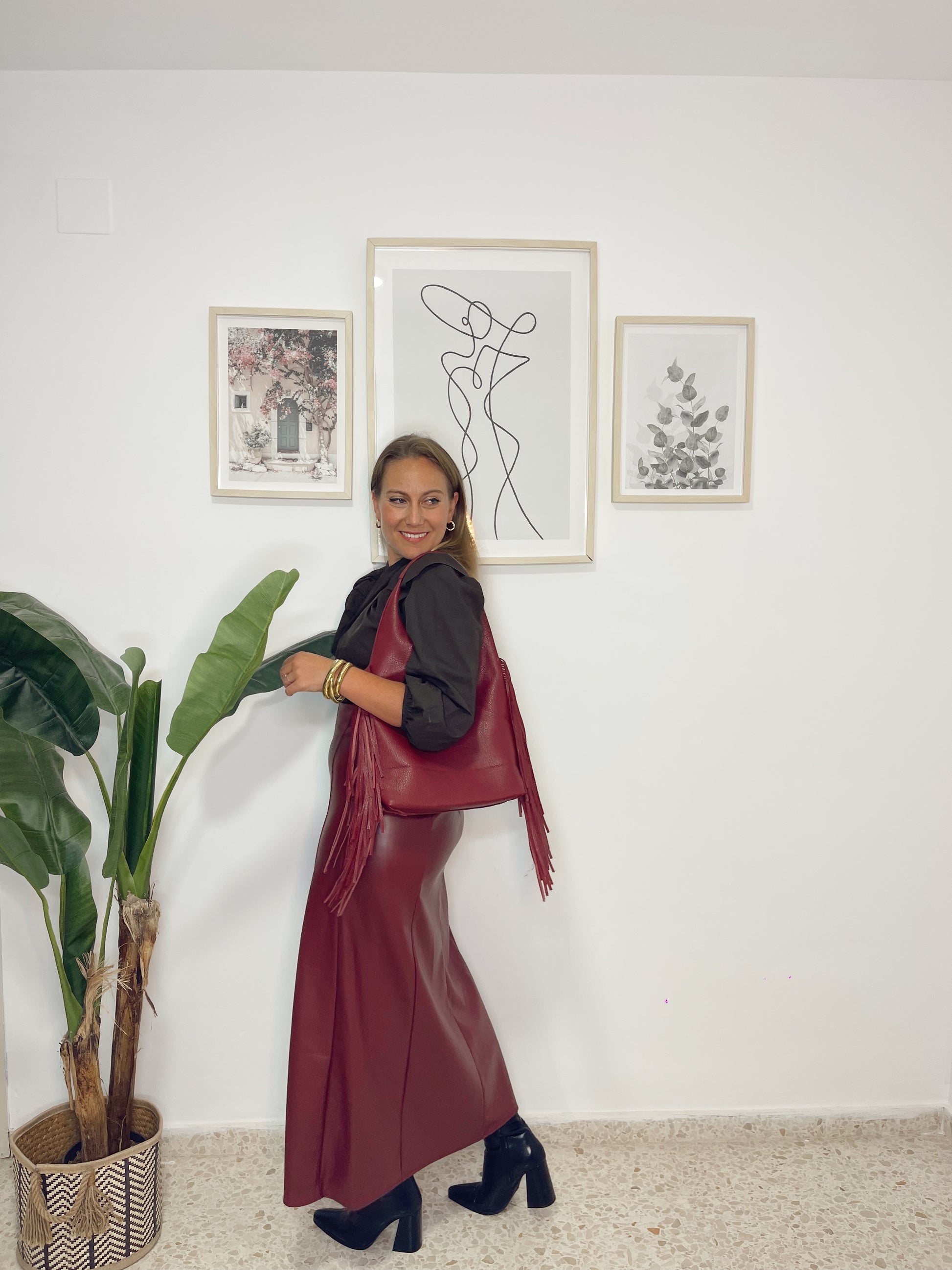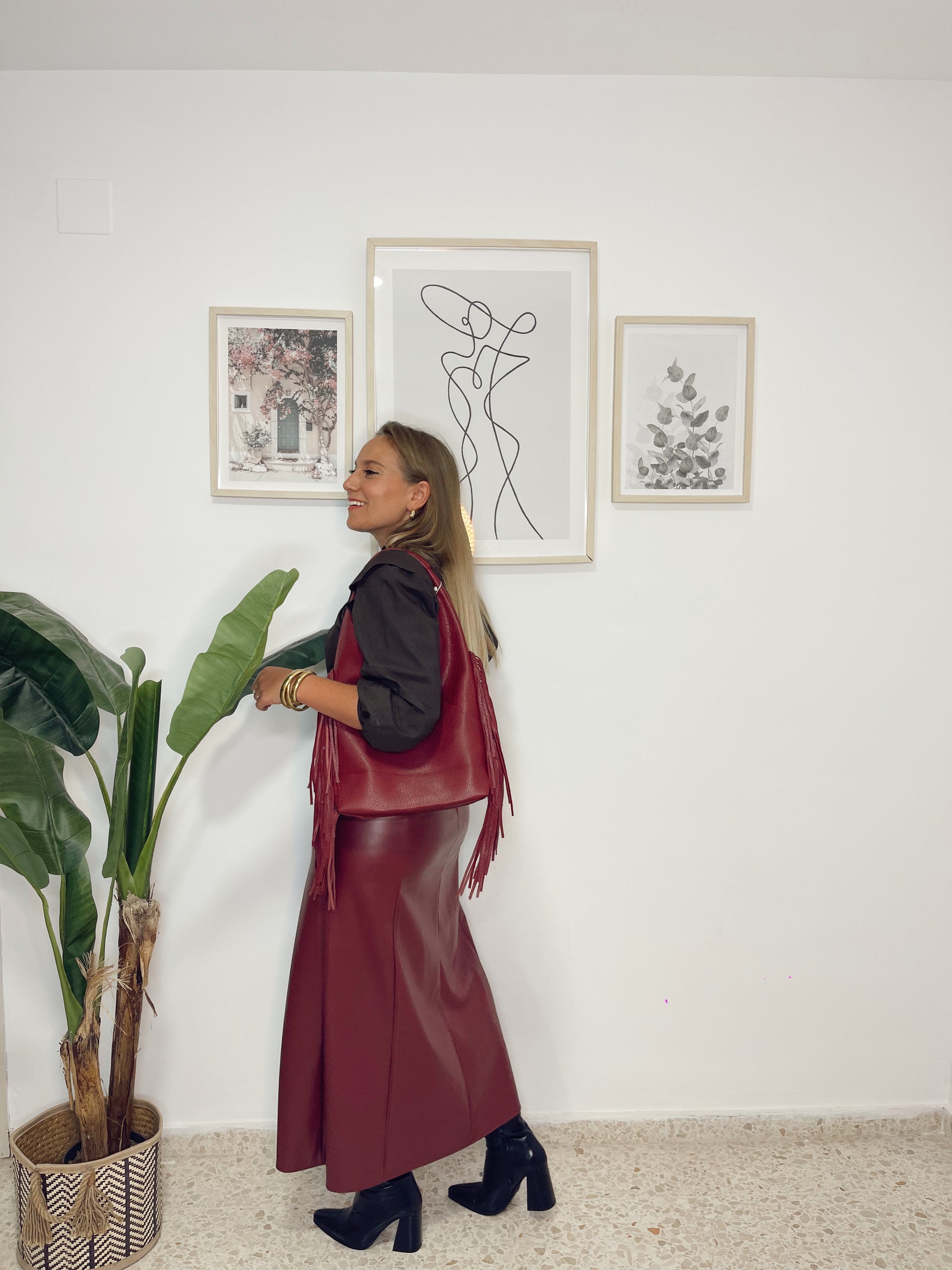 Bolso flecos efecto piel burdeos + neceser interior + cinta bandolera