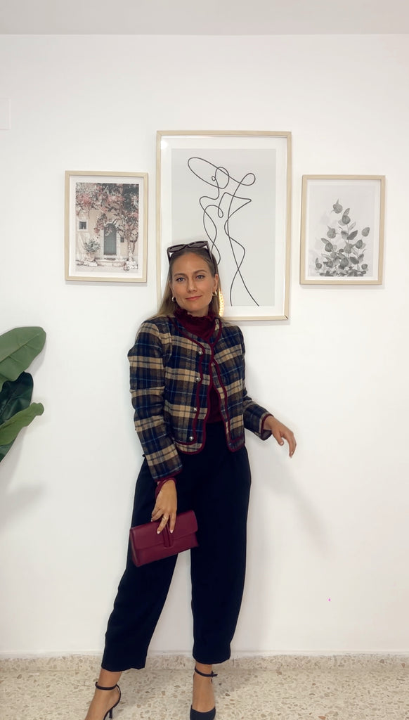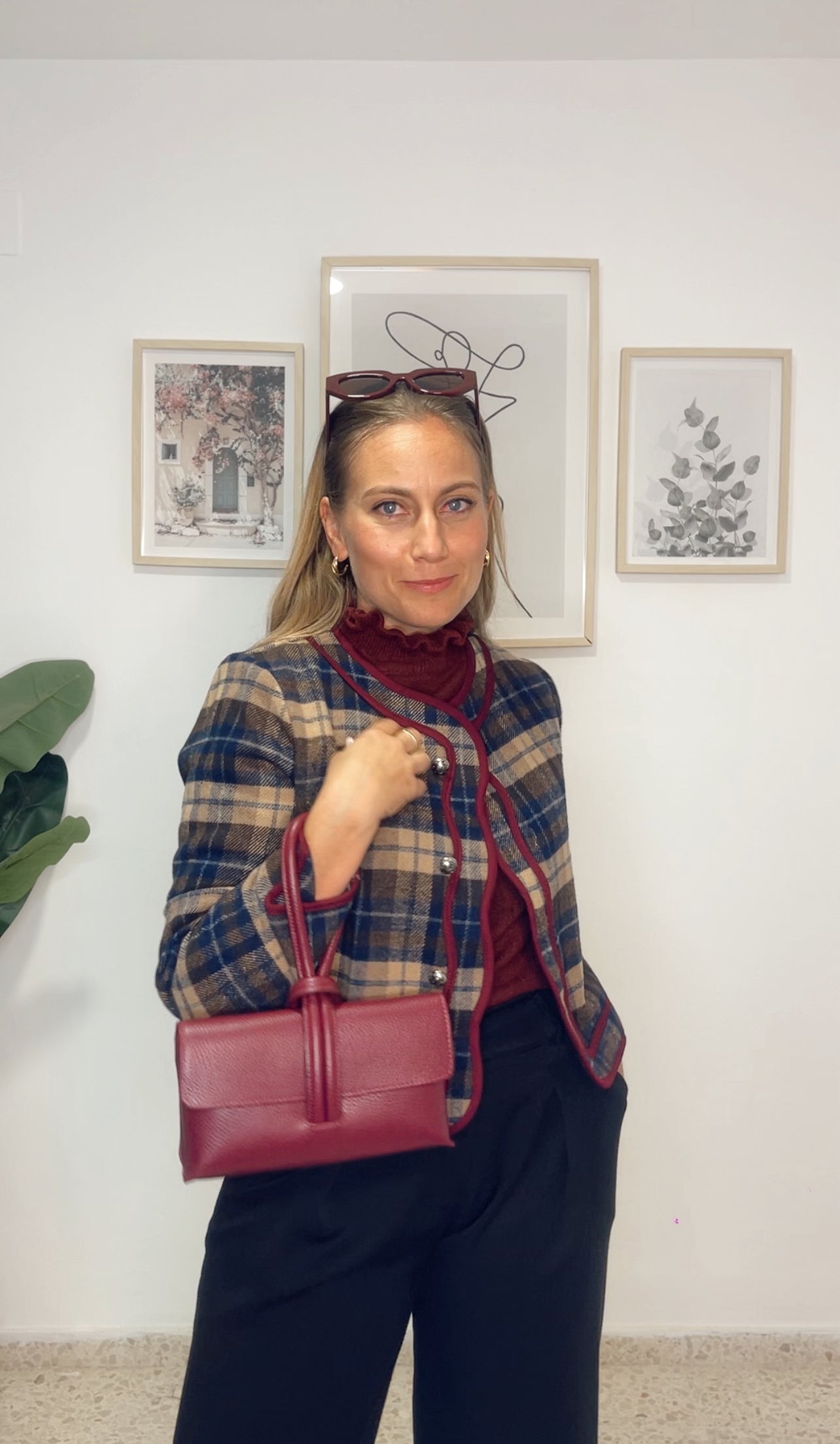 El detalle en onda en forma de ribete burdeos, de estilo elegante y femenino. Corte en estructura con botones metálicos frontales