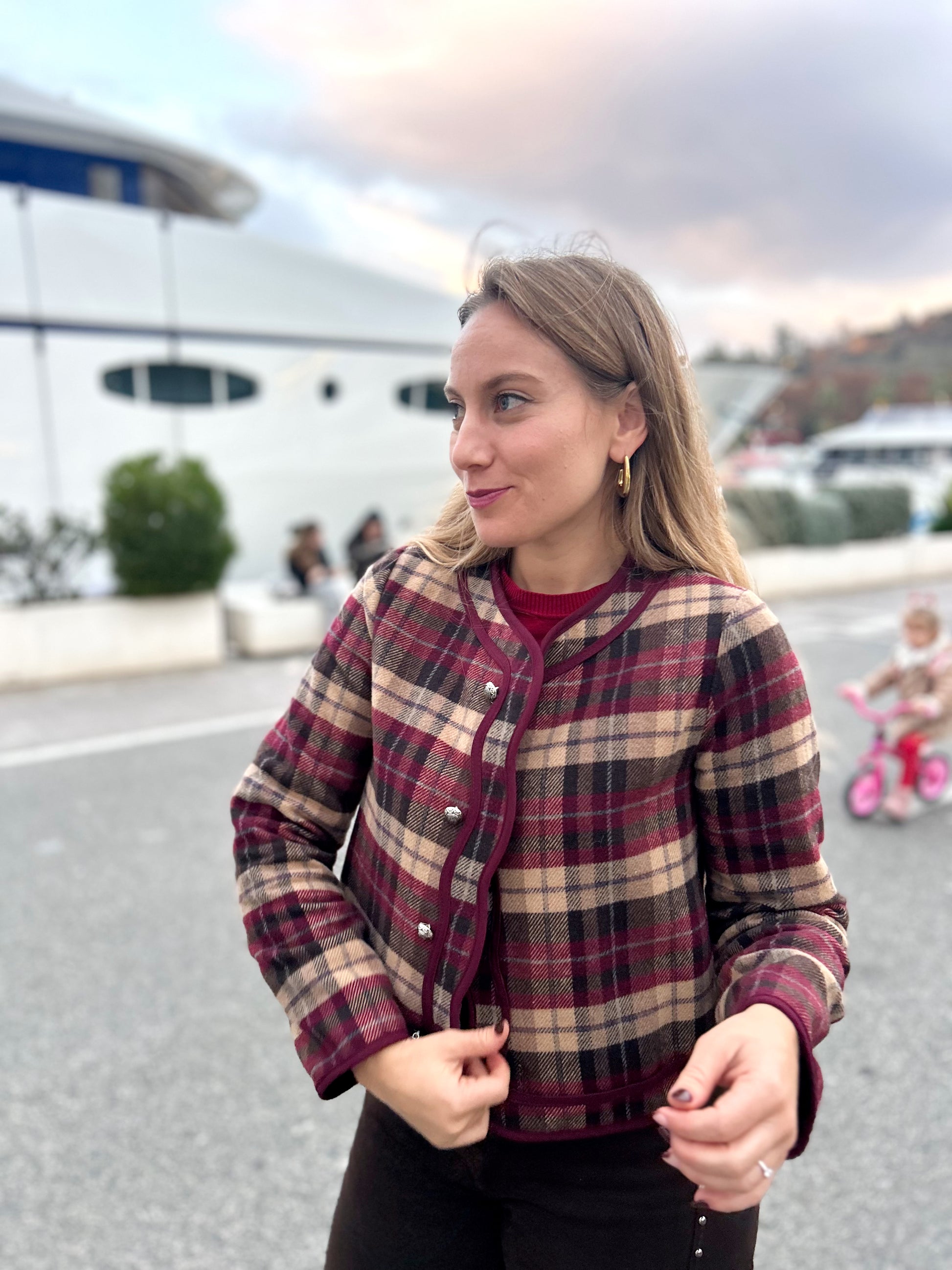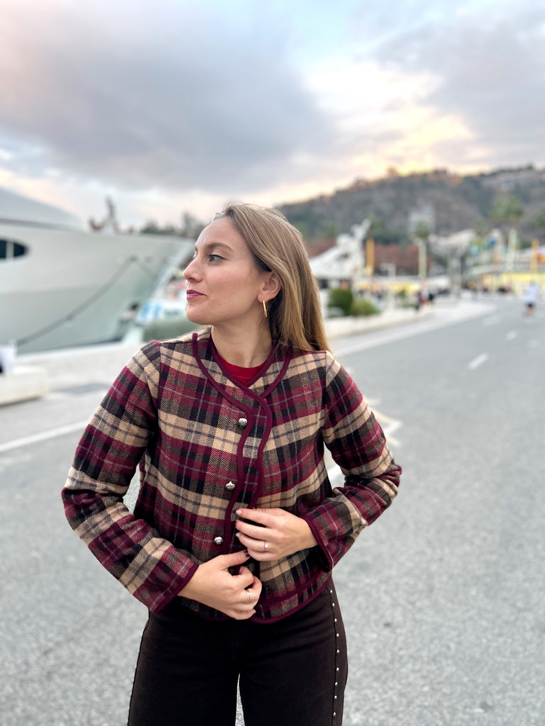El detalle en onda en forma de ribete burdeos, de estilo elegante y femenino. Corte en estructura con botones metálicos frontales