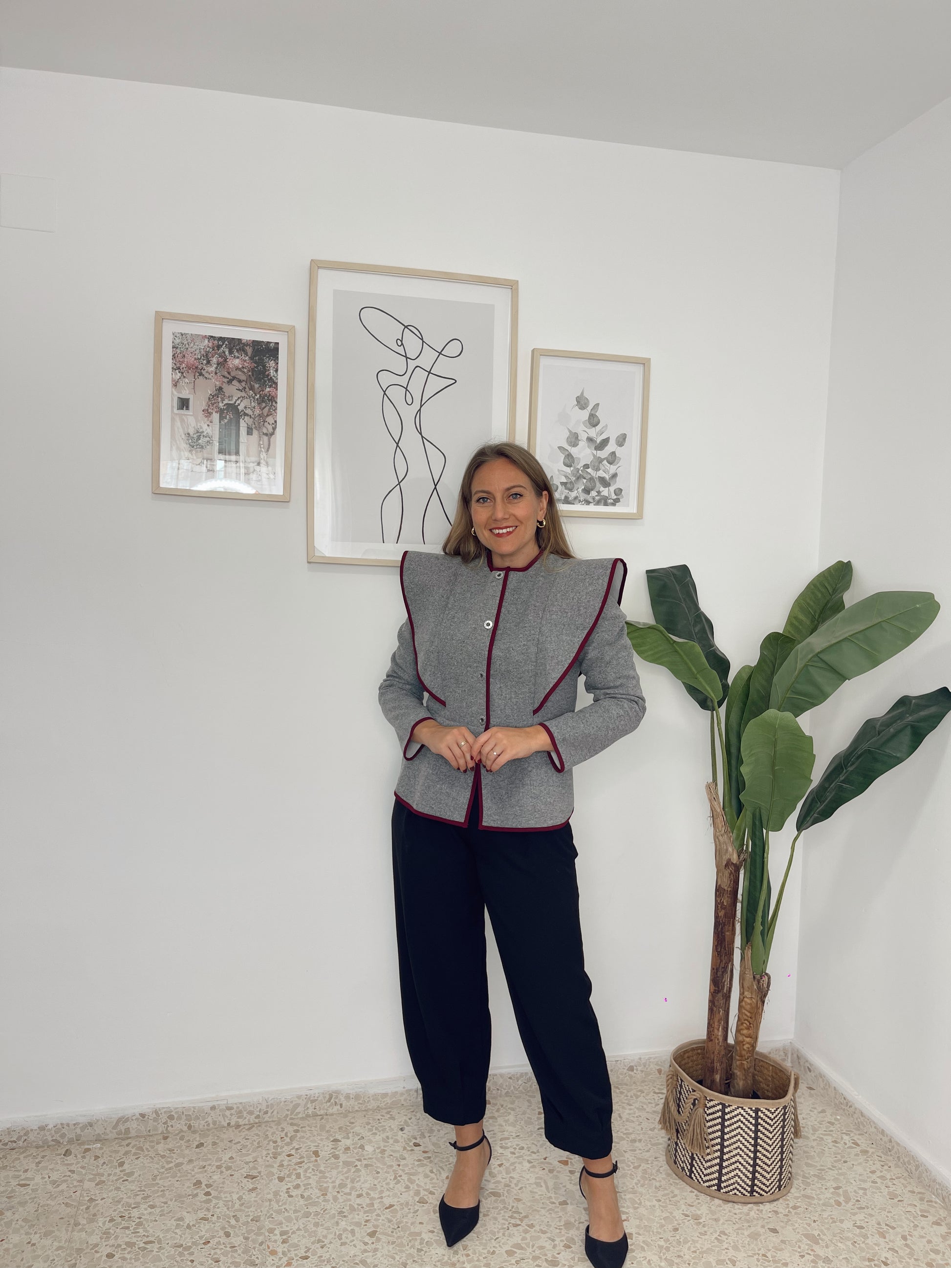 El detalle del ribete burdeos, de estilo elegante y femenino. Corte en estructura con botones metálicos frontales