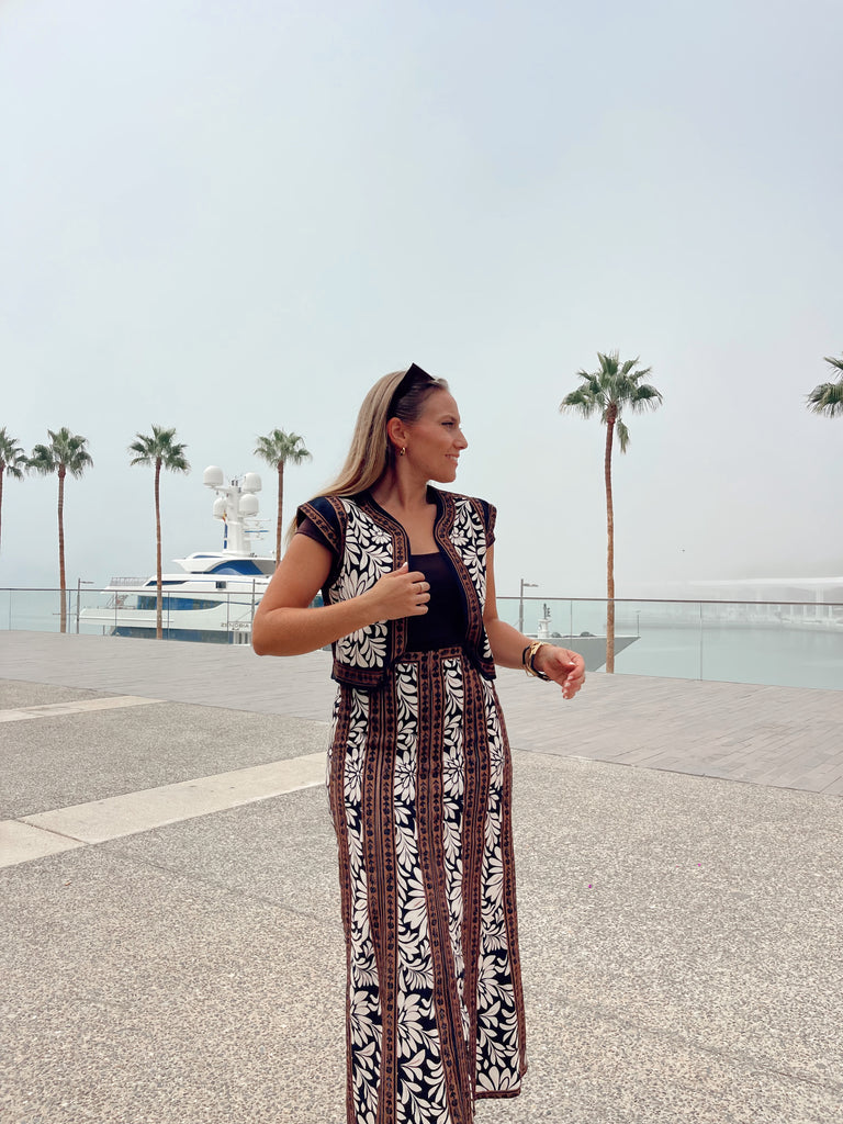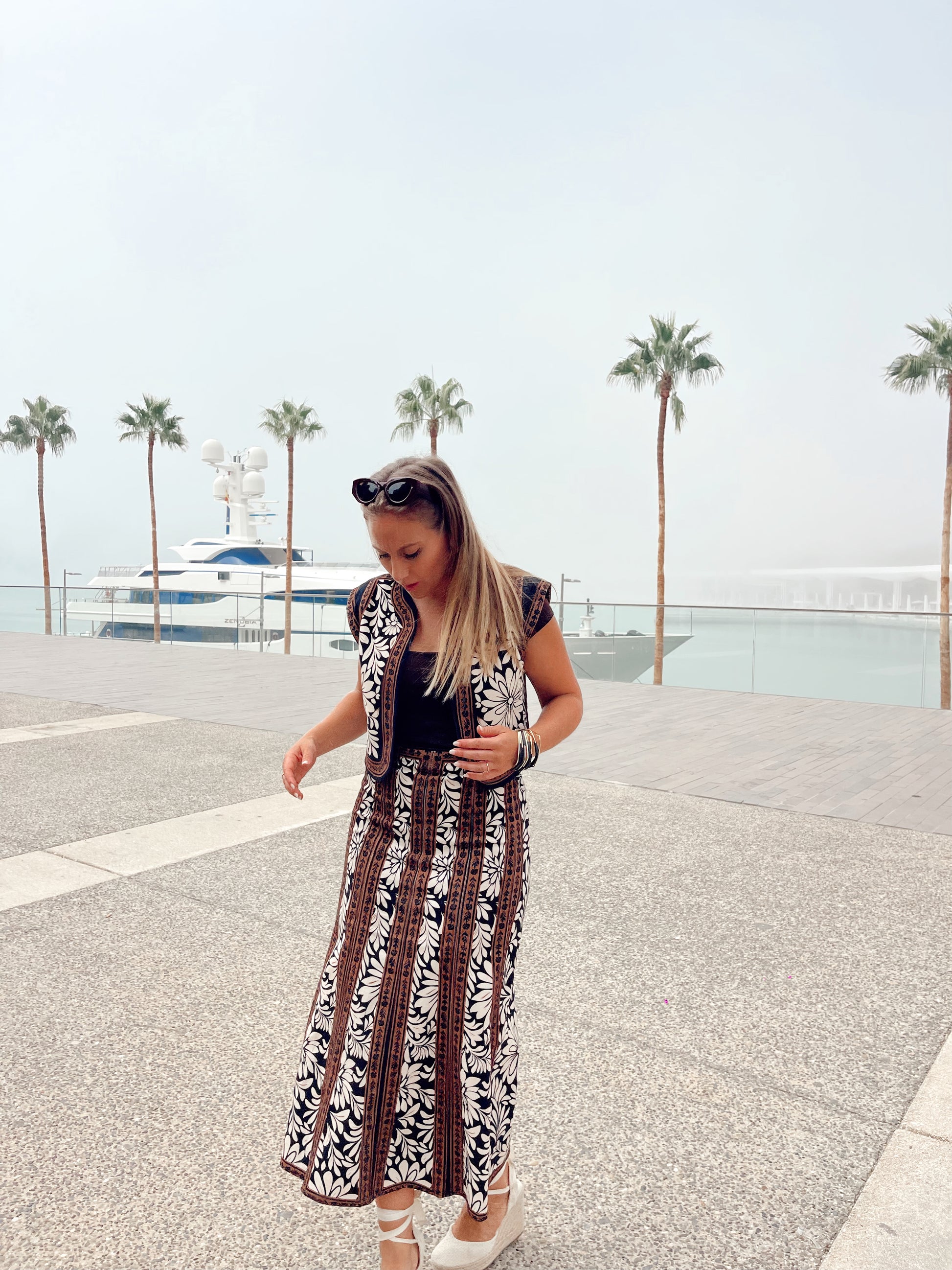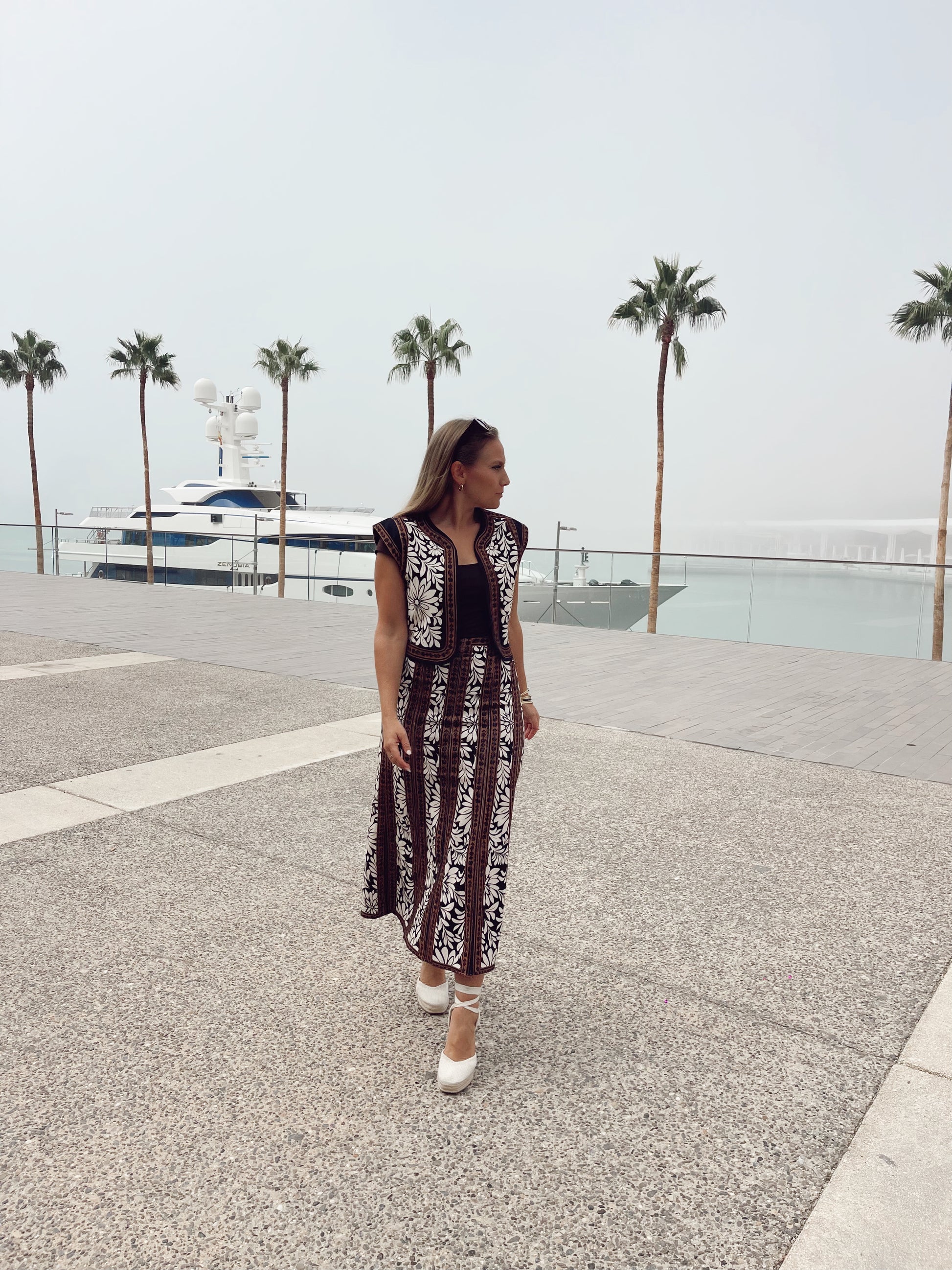 Conjunto con tela firme estilo vaquero pero elástica. Goma en la parte de atrás, en la cintura y falda ligeramente en evase