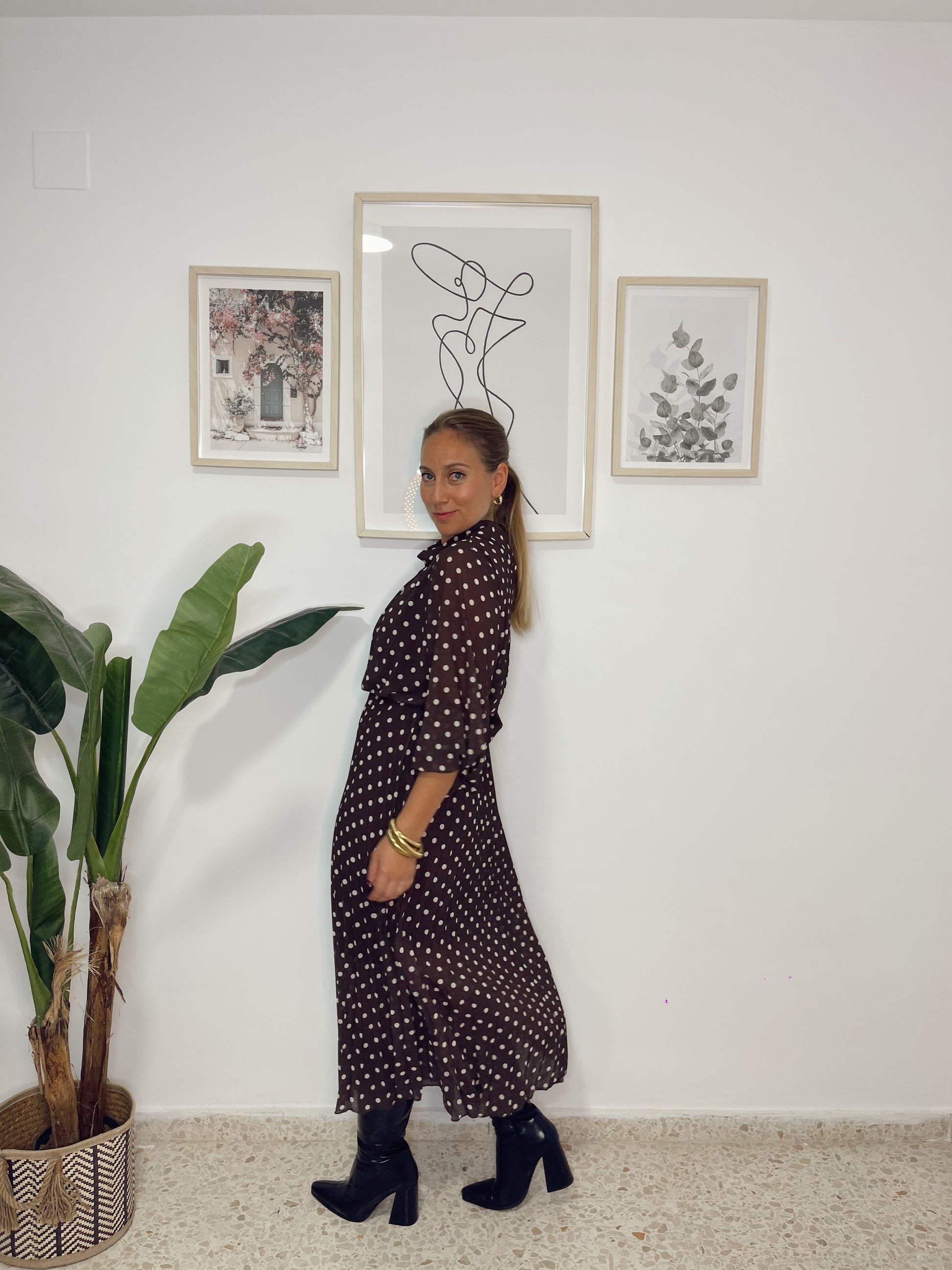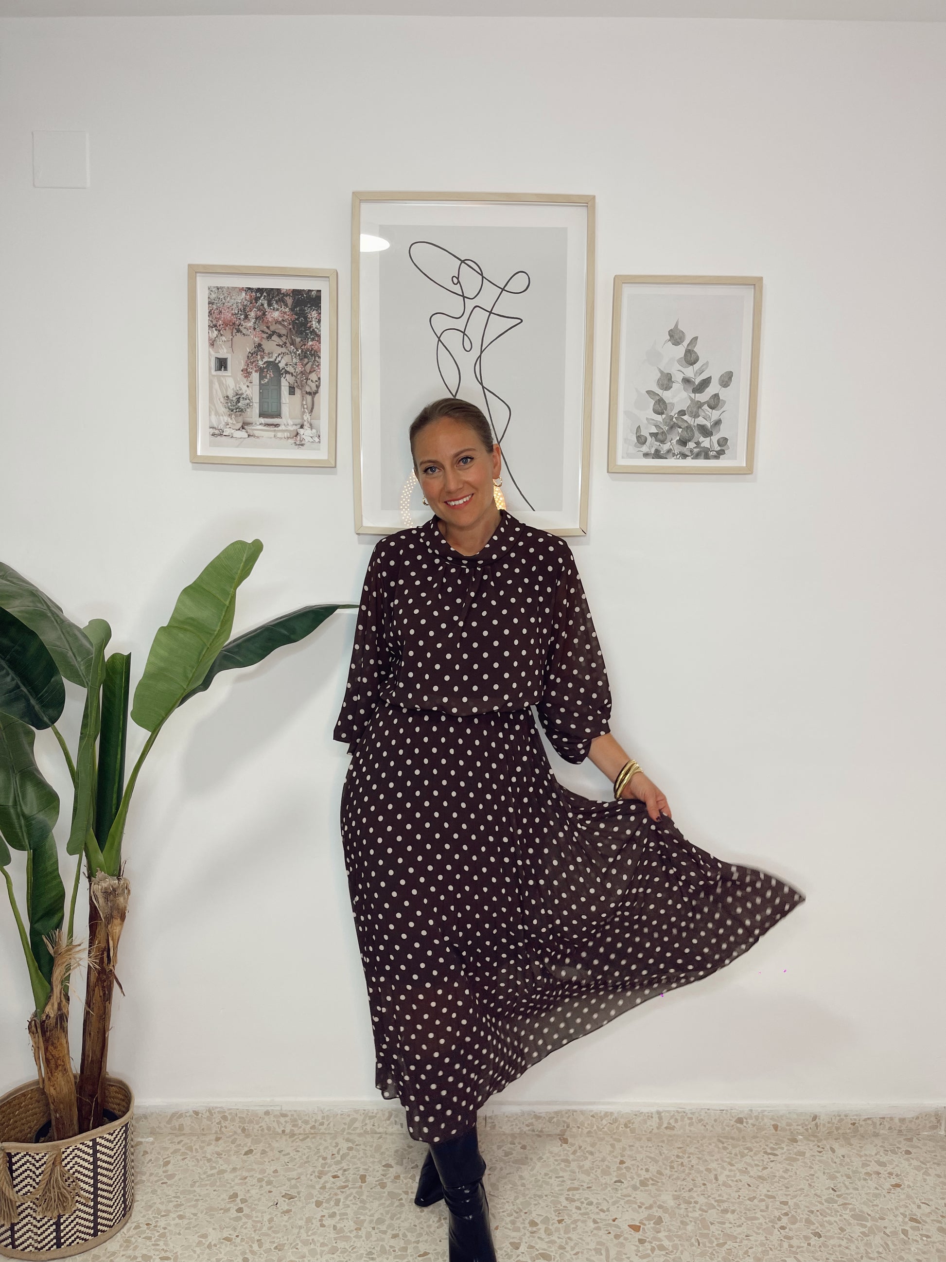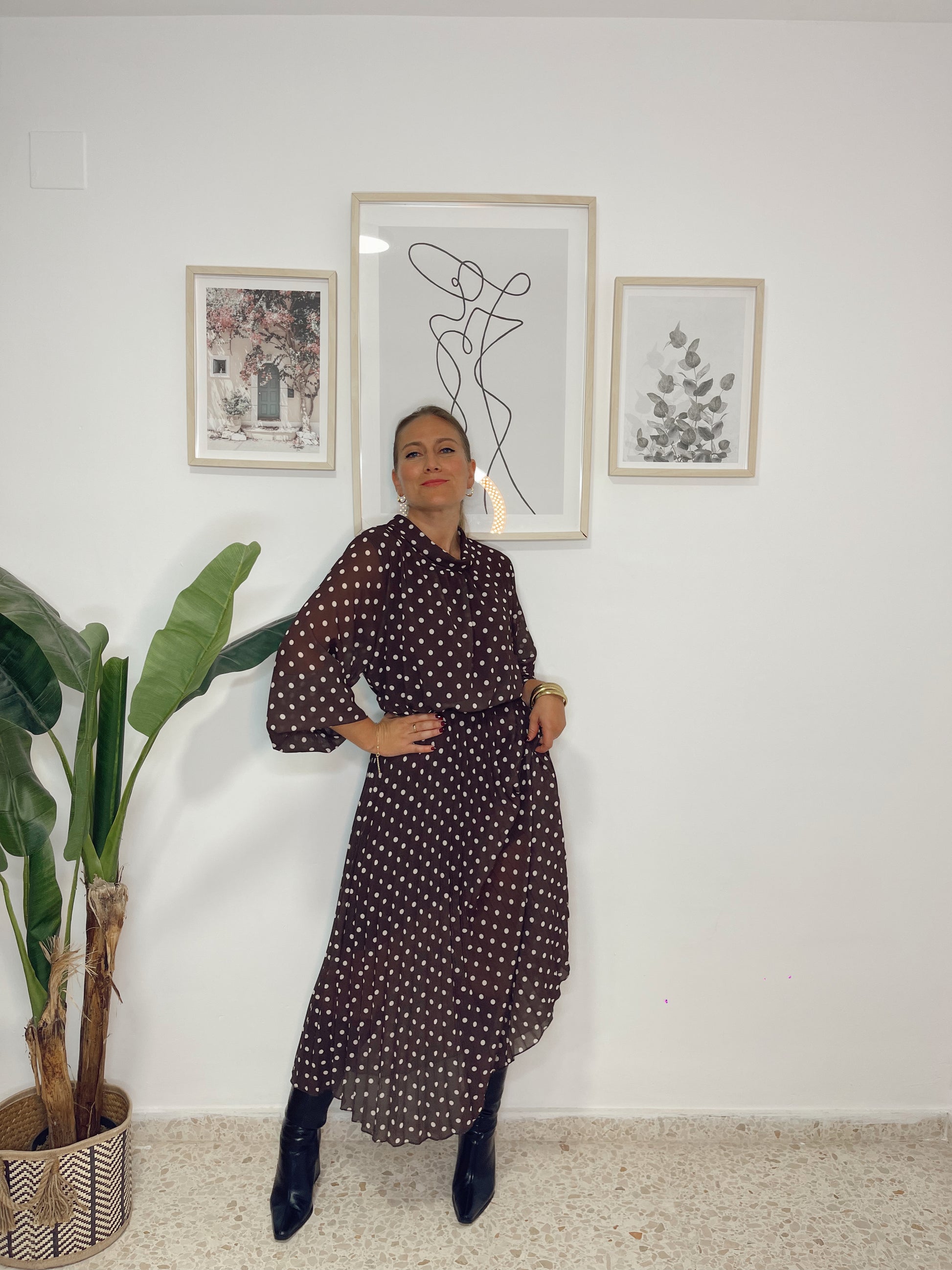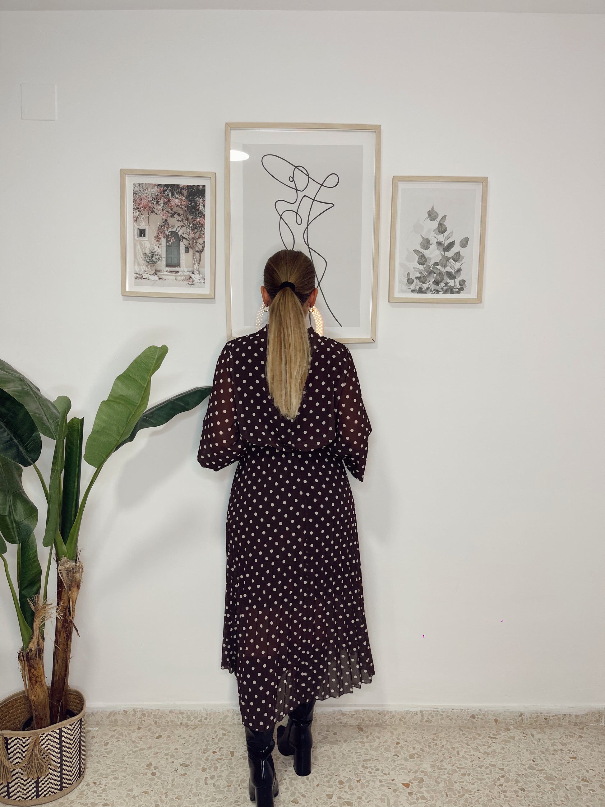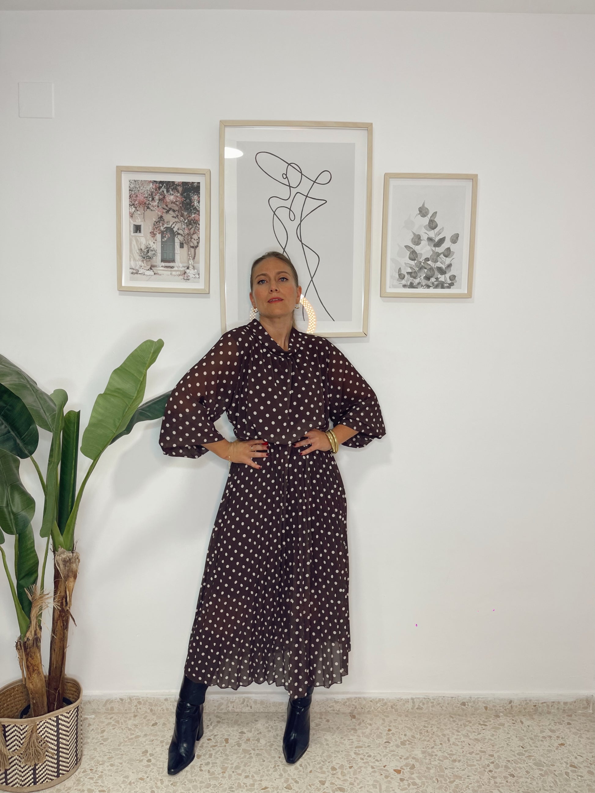 Vestido lunares plisado marrón